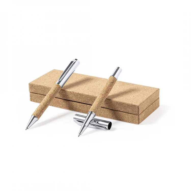 Set of ballpoint and roller pens from the nature line. Made with a combination of natural cork and metal to promote the use of natural raw materials and reduce polluting emissions. Ballpoint with a twist mechanism and roller with a cap, featuring a metallic jumbo refill. Packaged in an individual cork case with a suede leather interior.Blue gel ink.