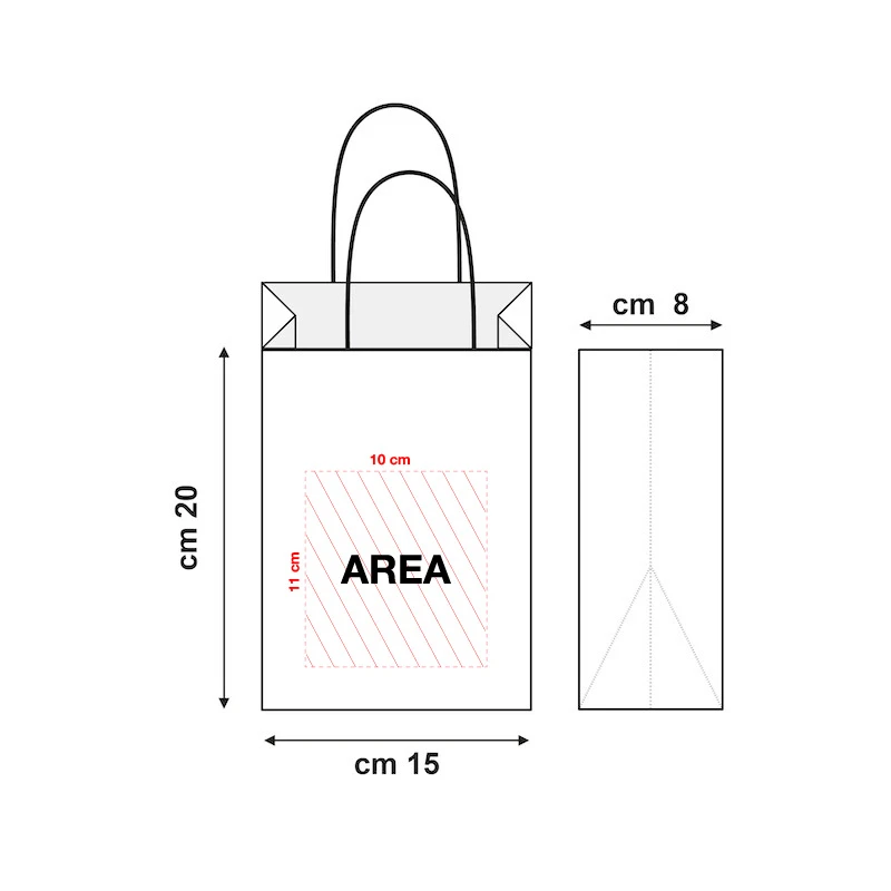Eco-friendly ribbed kraft paper bag with twisted handles, size 15×8×20 cm, printed on both sides with company logo. Designed for shops, events and retailers seeking sustainable packaging. Includes free printing plates and choice of flexographic, screen or hot-foil printing.