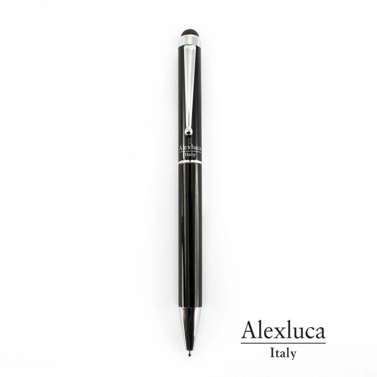 Penna a sfera by Alexluca con meccanismo twist e corpo nero in metallo liscio e dettagli in color argento. Confezionata in una singola scatola nera con il logo del marchio. Inchiostro blu.