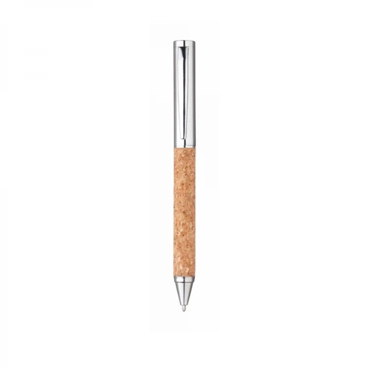 Penna a sfera in sughero e metallo. Confezione in astuccio di sughero. Inchiostro nero.