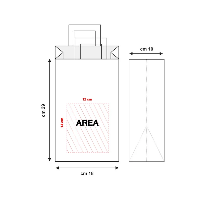 Realizzata in carta sealing avana da 110 g/m² con manici piatti rinforzati, offre una resistenza fino a 4,8 kg. La stampa personalizzata su entrambi i lati è già inclusa nel prezzo e gli impianti di stampa sono gratuiti per tutte le tecniche: flessografica, serigrafica o stampa a caldo.