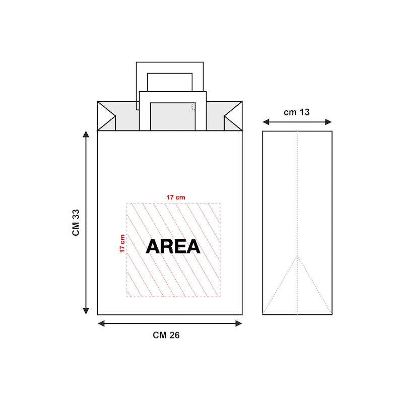 Realizzata in carta naturale con texture rigata e completamente biodegradabile, dispone di manici piatti rinforzati e di una stampa su entrambi i lati inclusa nel prezzo. Gli impianti di stampa sono gratuiti, garantendo una personalizzazione accurata e di alta qualità per ogni esigenza aziendale.
