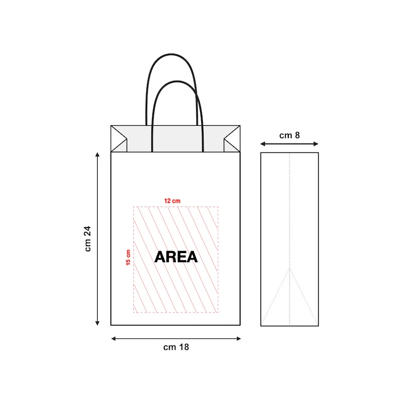 Realizzata in carta kraft bianca da 110 g/m² con manici in cordino ritorto, unisce resistenza e stile in un formato compatto ma funzionale. La stampa personalizzata su entrambi i lati è inclusa nel prezzo e gli impianti di stampa sono completamente gratuiti per le tecniche flessografica, serigrafica e a caldo.