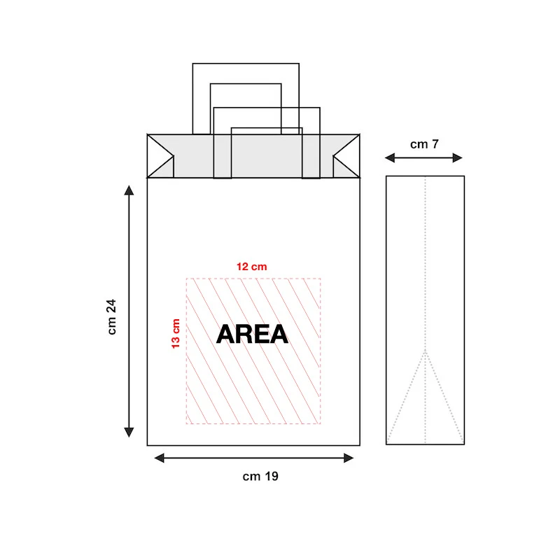 Dimensioni 19 cm (larghezza) + 7 cm (soffietto) x 24 cm (altezza)