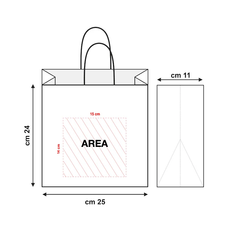 Il formato 25×11×24 cm si distingue per la sua proporzione orizzontale, ideale per capi piegati, accessori, piccole scatole o articoli fashion. Questo taglio basso e largo la rende perfetta per boutique, negozi di abbigliamento, eventi promozionali e concept store che puntano su un’immagine sostenibile ma raffinata.